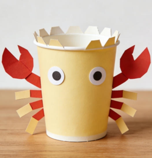 1. 用彩色手工紙將一次性紙杯包裹裝飾,作為螃蟹的身體,可以選擇孩子喜歡的顏色,如紅色、橙色等。